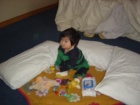 hier hebben we wat geïmproviseerd zodat ons vedette niet op haren totter valt (ze zit nog niet altijd even stabiel) en zo kan ze heel zelfstandig zitten spelen...