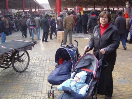 Gisteren had ons Ella Yun op haar tong een aantal witte cirkeltjes, precies bloemetjes. Ze had er totaal geen last van, maar toch nog even een internationaal doktersconsultje gedaan. Het is een soort schimmel, candida, afkomstig van de melkproducten. Het deed geen pijn, maar we zijn toch voor de zekerheid naar de apotheker geweest, samen met Wan Yu, onze Chinese gidse hier ter plekke en Katleen, op zoek naar Daktarin of iets gelijksaardigs. We kregen een stuk of acht verkoopsters rond ons staan in de apotheek, maar geen daktarin, of geen middel met dezelfde samenstelling. Ze hadden wel iets voor candida tussen de voeten, maar ze begrepen niet echt dat dit dezelfde schimmel was op haar tong. Enfin, uiteindelijk kregen we iets te pakken, op basis van kruiden, dat ontsmettend werkt. Bijsluiter natuurlijk enkel in het Ch inees. We hebben het met drie dan eerst maar eens uitgeprobeerd op onze eigen tong. Het smaakte nu niet lekker, moet ik zeggen. Ons Ella Yun had er precies minder problemen mee. Ze trok een beetje een gezicht, maar dat was het dan. In elk geval de schimmel kan totaal geen kwaad, is echt niet gevaarlijk, ze kunnen er alleen een beetje hun eetlust door verliezen en dat is echt niet het geval ! Papjes, groentepap, appelmoes met 2 hele bambixen : toch geen probleem ? Ze begint zo stilletjes aan de bourgondische eigenschappen te vertonen van de familie Van Hees-Temmerman.