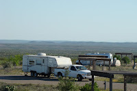 Fort Davis een klein plaatsje 200 km ten noorden van het Big Bend Nat. Park. Daar staan we nu maar eerst nog even over het Big Bend Nat.Park. Een groot park dat ligt in de U bocht die de Rio Grande maakt. Het is de Chihuahuan woestijn. Met grote imposante kloven er in, en aan de ander kant van de Rio Grande is Mexico. Je ziet een dorpje liggen met mensen onder een boom. En eindje verder 3 mannen aan het werk, een ploeg 2 paarden ze zijn het land aan het bewerken op een manier die wij alleen nog van plaatjes kennen. Aan onze kant liggen op een rots wat van kraaltjes gemaakte beestjes o.a. de roadrunners en schorpioenen. En wandelstokken met een kartonnetje erbij met de mededeling dat het voor de kindjes van het dorp aan de overkant is. Joop staat te kijken en even later komt 1 van mannen op een paard door de rivier die dus maar heel laag is met een duitse herder naar ons toe en probeert ons wat te verkopen en dat lukt natuurlijk. De laatste avond bij het B.B.N.P. breekt er een onweer uit . Aan het eind van de bui (die trouwens erg lang duurde) waren er prachtige regenbogen te zien. Bij Fort Davis is er boven op een berg een sterrenwacht van de universiteit van Texas. Ze hebben allerlei programmas en wij er dus naar toe. Reuze interessant, aardige mensen en s avonds terug gegaan om naar de sterren te kijken. Als een van de weinige hebben wij Saturnus met zijn ringen door de telescoop gezien.Het was te bewolkt maar de directeur en Joop hadden goed contact en we mochten alvast mee naar de telescopen. Er komen ca 200 mensen per keer naar de sterren kijken in de lente vakanties is dat 900. Dus we waren erg blij met de privé viewing. Het state park heeft hele bijzondere kwartels. Montezuma kwartels of clown kwartels. Gisterenavond kwamen er 3 Javelinas (soort wild zwijn) langs, hertjes lopen hier ook te kijken of er lekker gras is, en een keur van vogels voor onze caravan, waar wij wat zaad hebben gestrooid. Lieve groeten Joopenlisa