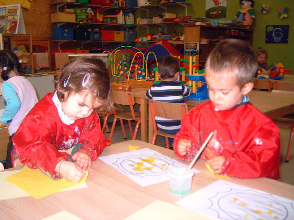 We scheurden stukjes geel papier en kleefden het op. We hadden dit nog nooit gedaan en we vonden het heel leuk! Na de speeltijd mochten we spelen in de hoeken.