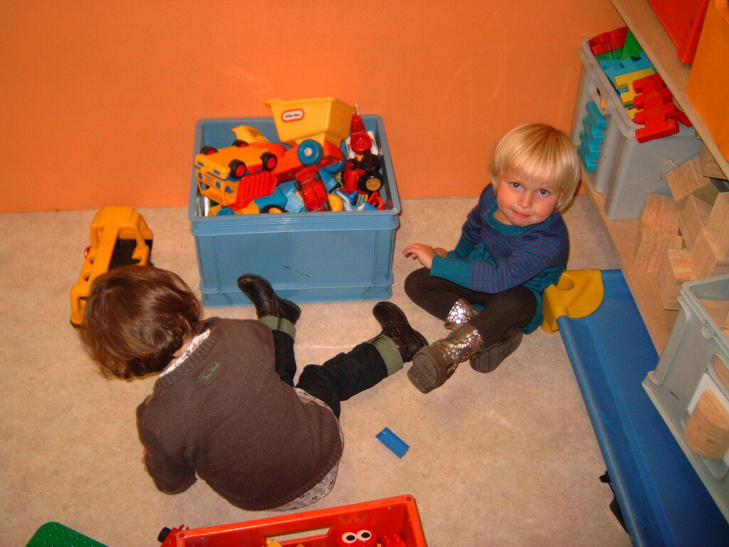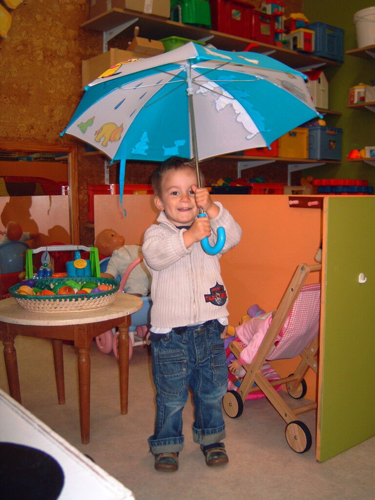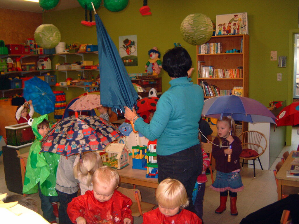 Daarna mochten we spelen in de hoeken. Tijdens we het spelen werd er plots op onze deur geklopt. We kregen bezoek van de klas van juf Gina (1ste KK). Ze waren op stap met hun laarzen, regenjas en paraplu. Het regende in hun klas en ze kwamen even bij ons schuilen.
