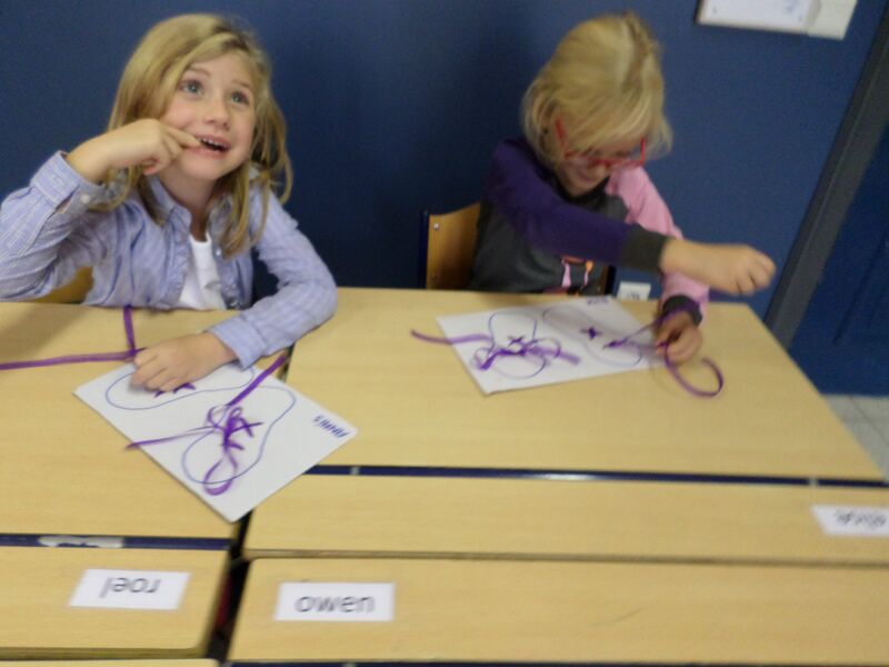 Schoenveters knopen... het blijft een moeilijke taak. Maar met de nodige inoefening en een helpende hand van een vriendje of de juf lukt het ondertussen bij enkele leerlingen al goed! Op het einde van deze les kregen we onze 'schoentjes' met kleurrijke veters mee naar huis om verder te oefenen.