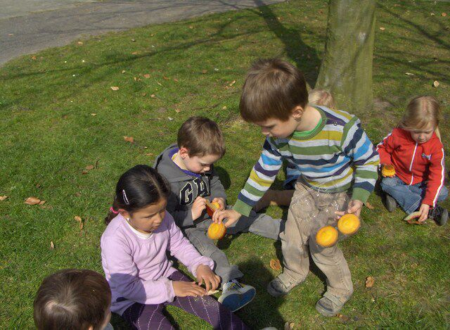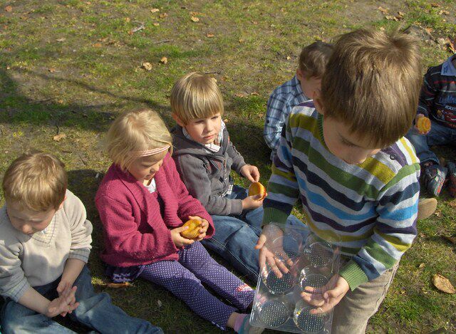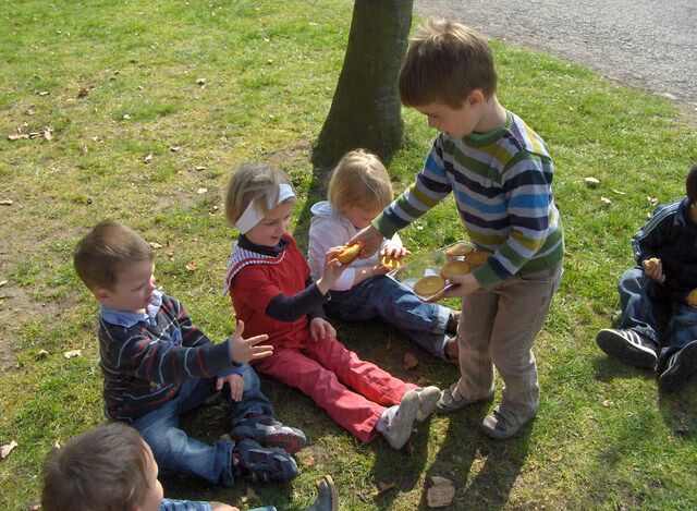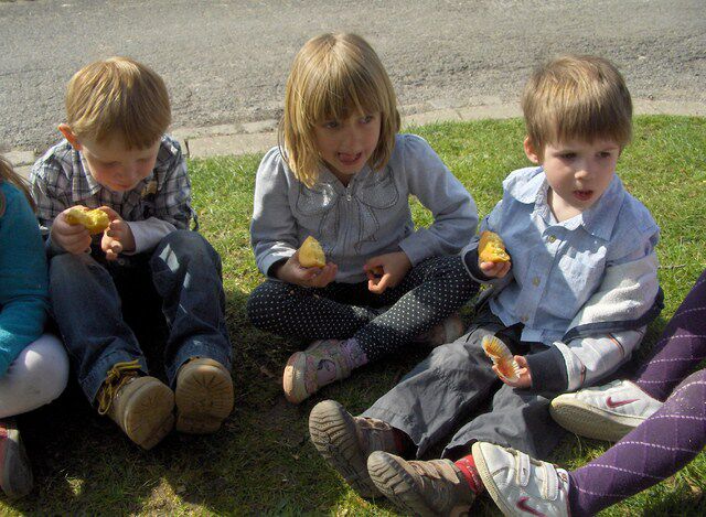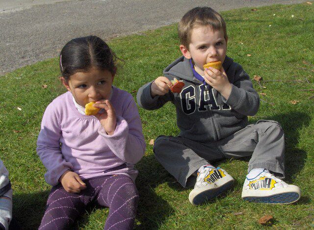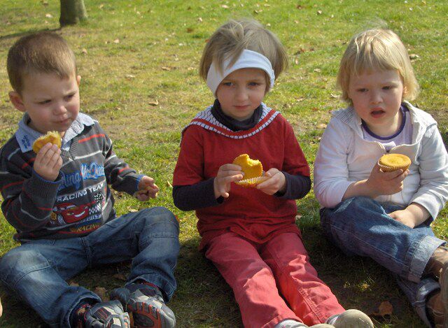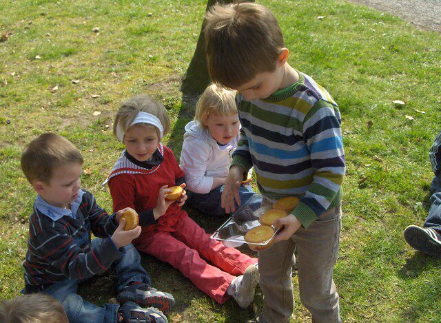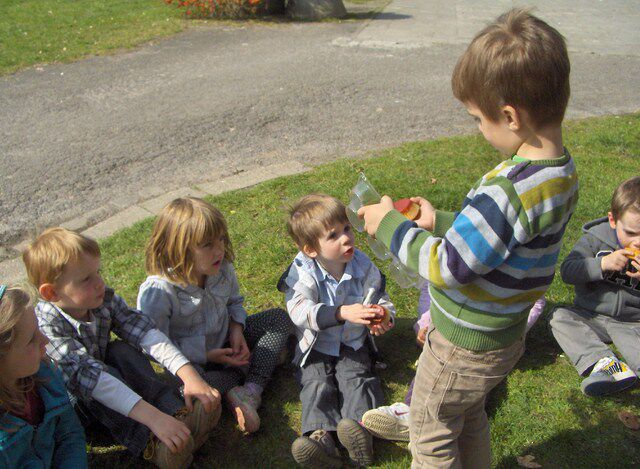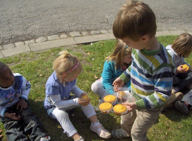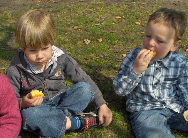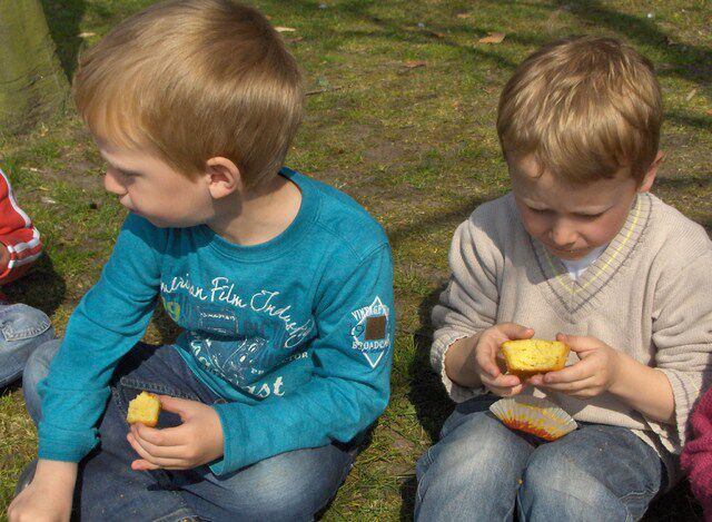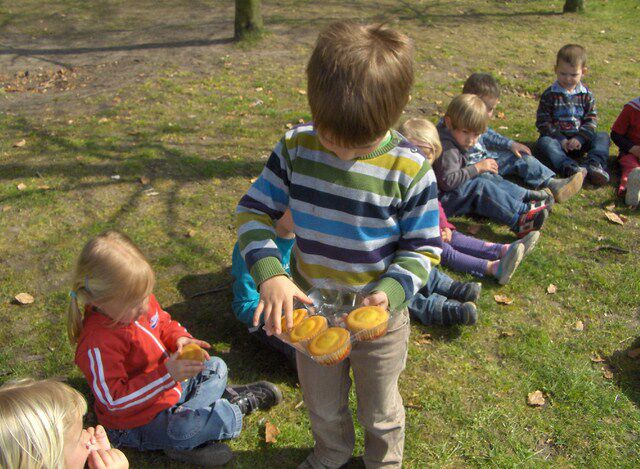 Gianni had nog een verrassing bij voor de kleuters en omdat het zo'n mooi weer was, konden we het buiten opeten.
