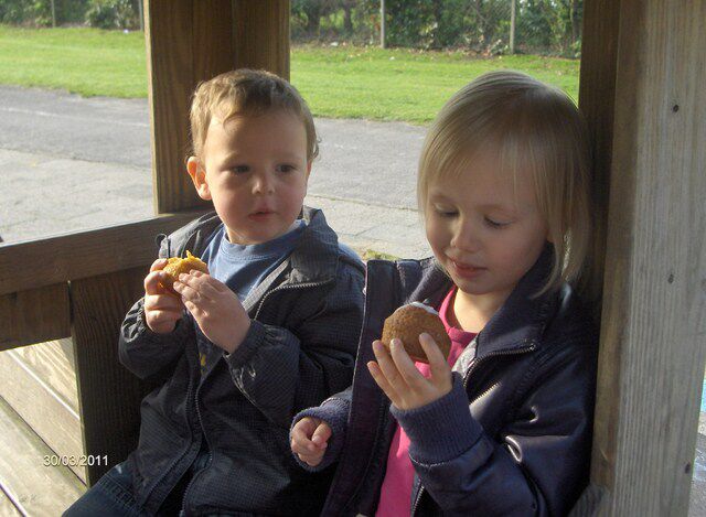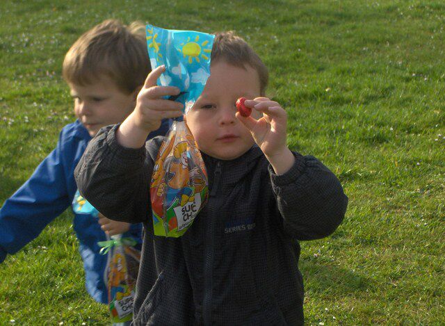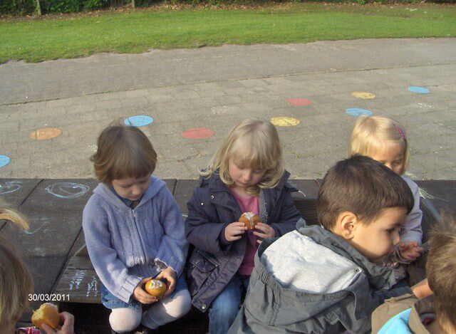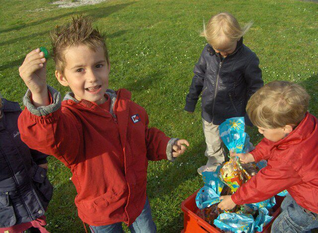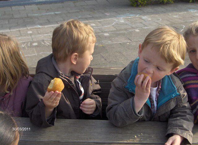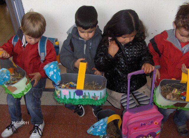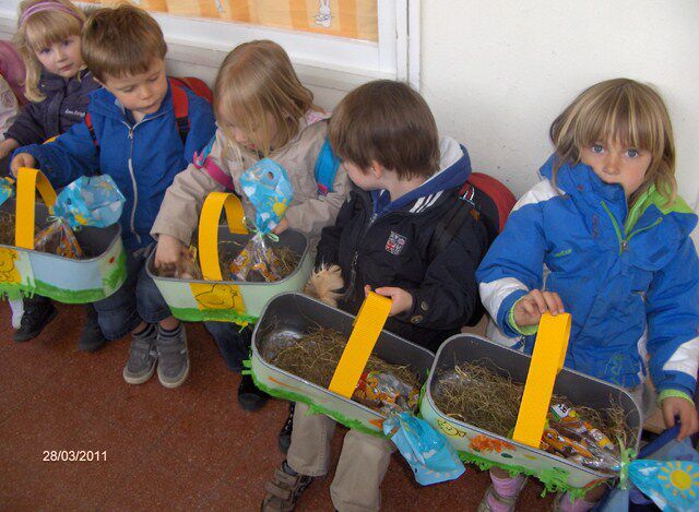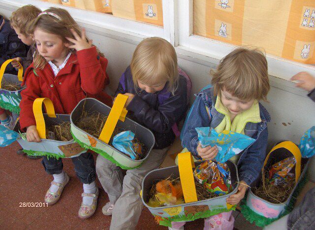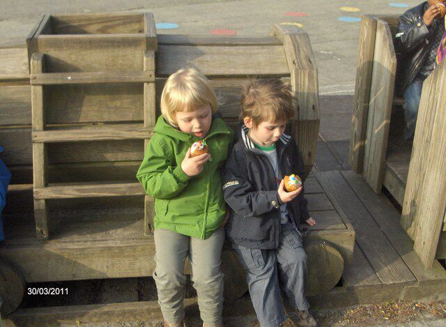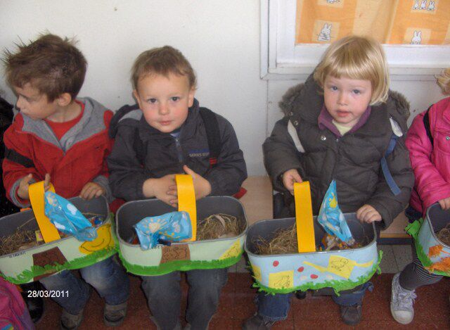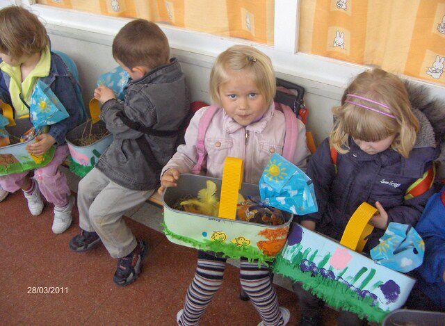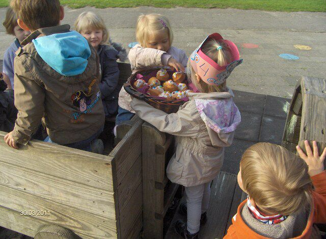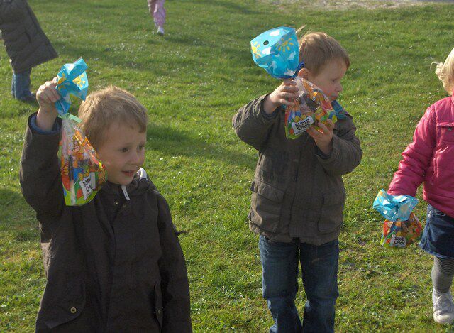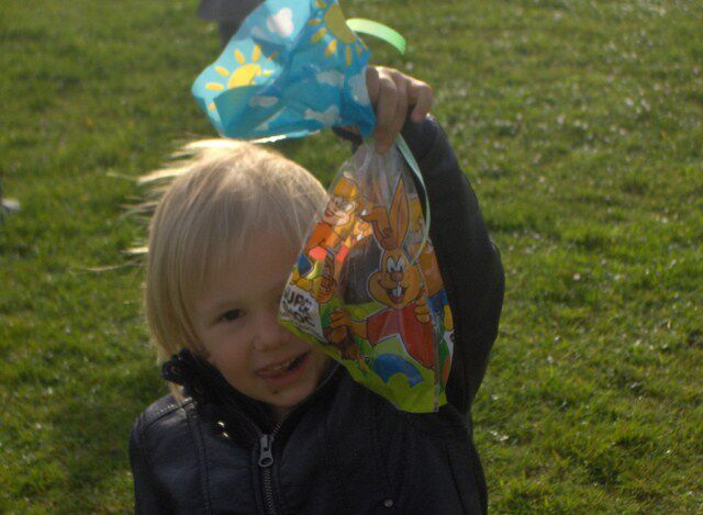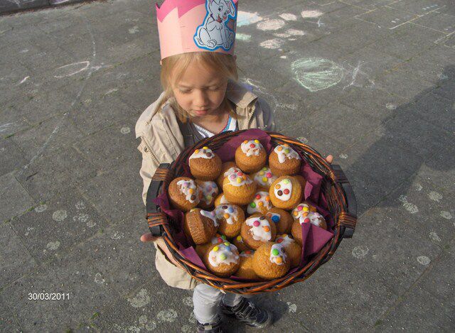 We nemen de paaseitjes in ons mandje mee naar huis. Dankjewel paasklokken!