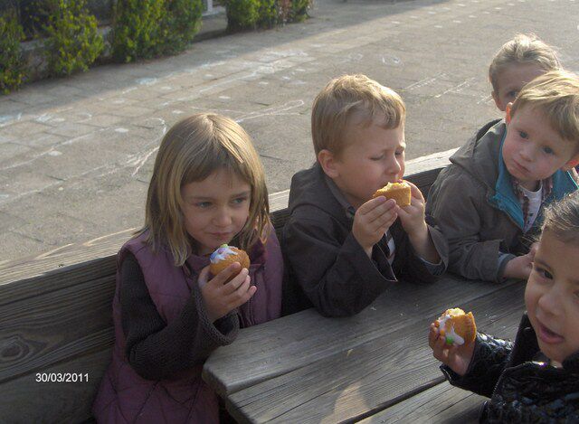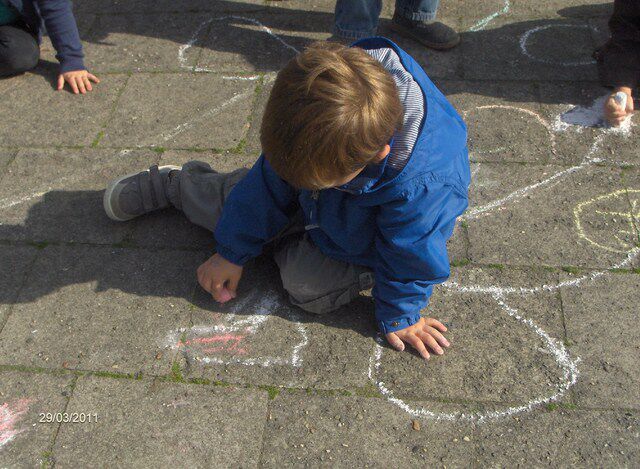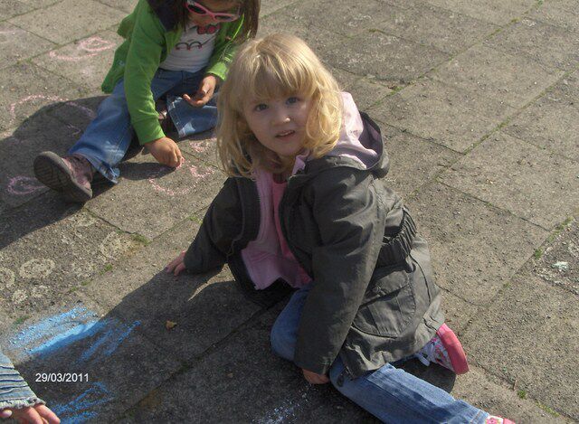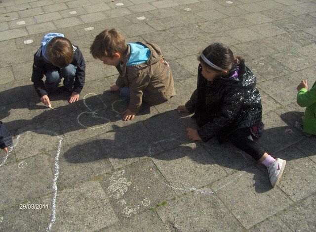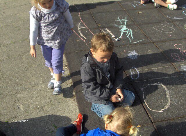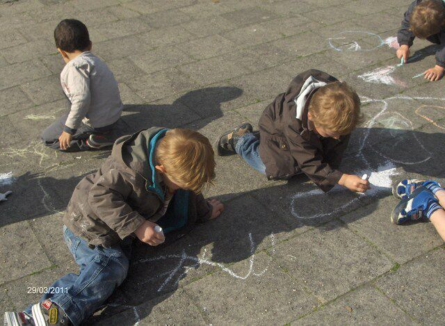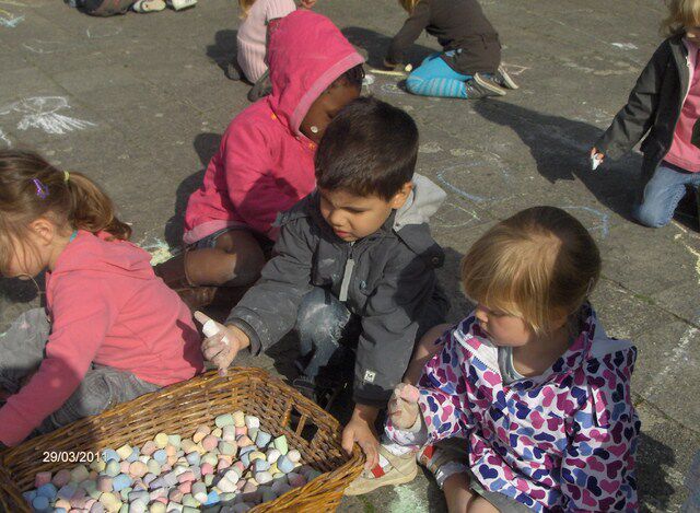 Omdat we heel wat centjes gespaard hadden voor de kindjes in Vietnam, tekenden we met krijt paaseieren en een paasklok.
