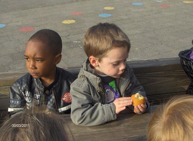 Hij heeft een geschenkje voor ons meegebracht:een prentenboek. Sommige kleuters maakten een tekening voor de Zonnekoning en daar was hij heel blij mee. Dankjewel Zonnekoning en tot volgend jaar! We kregen ook nog een lekker ijsje en smulden het samen op in de speeltuin van de school.