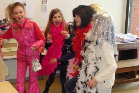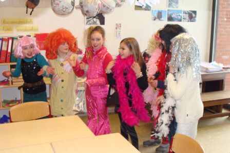 We bereiden Carnaval voor om helemaal in de stemming te geraken...maskers worden gemaakt! Een kleverige boel, maar het resultaat zal goed zijn! 8 leerlingen staan niet op de foto...ze gingen helpen in 2Kb bij juf Marleen.