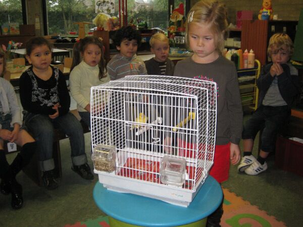 Eerst kwam er een lief vogeltje in ons klasje , het was een geel kanariepietje en we gaven het de naam Pico. Daarna gingen we schilderen een kooi voor een mooi wit konijntje . En maandag mogen we ons diertje meebrengen .