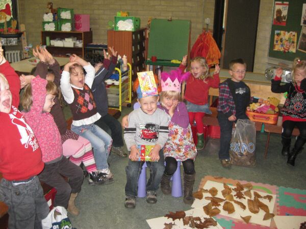 Amai wat een feestje , we hebben gedanst , gezongen en heel lekkere boterkoekjes gegeten die mama gebakken had , en ook een mooi geschenkje , een memoryspelletje , daar mogen we allemaal eens mee spelen in de klas , en ook kregen we nog een geschenkje mee naar huis dank je wel mama en papa!