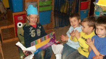 Vorige week werden we door de bibliotheek uitgenodigd! Dit omdat het voorleesweek was! Mama Lars en mama Maarten hebben ons mee begeleid naar de bibiloitheek! Gelukkig konden we met de schoolbus gaan, want het regende ontzettend hard! Na het verhaaltje (sprookje van Annie M.G. Schmidt) kregen we nog een mooi boek van 'Vos en Haas'!