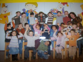 Waarschijnlijk hebben jullie er thuis al van gehoord! Onze klas doet mee aan de wedstrijd 'Zing en win' met Kapitein Winokio! Mama Lars, kwam met het idee af! Zij las een artikel in de 'zondag' over deze wedstrijd! Ik vond het een leuk idee! Wat moesten we doen? Via de website konden we uit 3 partituren een liedje kiezen.('In een klein stationneke', 'Slaap kindje slaap' en 'In het bos daar staat een huisje') Uiteindelijk hebben we voor het laatste gekozen ('In een bos daar staat een huisje') Op dit liedje moesten we een andere tekst verzinnen! We kozen voor het thema kastelen, thema dat alle kleuters aanspreekt, waar we al rnd gewerkt hadden en omdat onze school op een kasteeldomein ligt. Samen met de mama van Lars zijn we dan op zoek gegaan naar woorden ivm Kastelen! Zo hebben een een knotsgek liedje in elkaar gestoken! Binnenkort krijgt iedereen de tekst mee naar huis. Ook moesten we een cd-hoesje ontwerpen! Alle kleuters hebben een kasteel met wasco's getekend, as dat klaar was, zijn we er met ecoline over gegaan! Om kapitein Winokio er helemaal bij te betrekken hebben we het hoofd van Kapitein Winokio gefotocopieerd en in elk kasteel bij geplakt! Leuk!