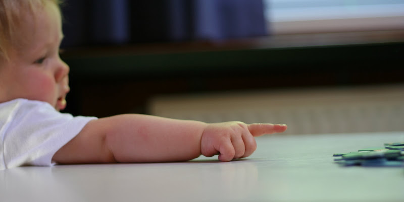 Twan grijpt naar puzzelstukjes, maar kan er net niet aan.