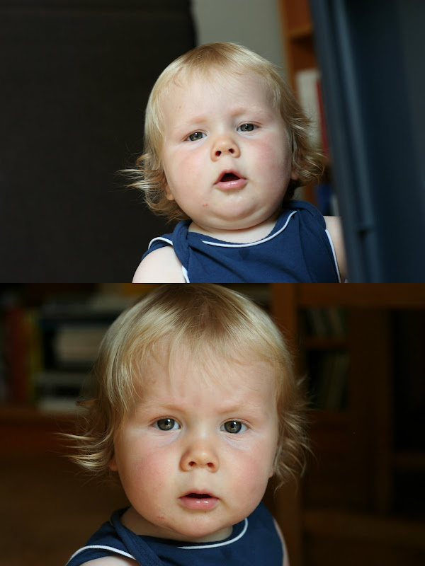 Beide foto's, getrokken op quasi 't zelfde moment. Welke is 't minst flatterend? De bovenste foto is getrokken van onder bekeken, terwijl de onderste genomen is met de camerapositie net boven de ogen.