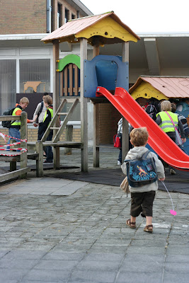 Senne heeft de allereerste (halve) schooldag goed overleefd. Hij kwam enthousiast thuis met stoere verhalen van de klaspop Jules die op z'n hoofd gevallen was.