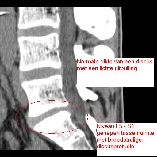 Conclusie: Een wat toegenepen discus met uitpuiling (discusprotrusio) aan de achterkant van de rug (rechterkant van de ruggegraat). Om het in verstaanbare taal te zeggen, ik zit in het stadium voor een hernia. Bij een hernia scheurt de discus dan open en komt er discusmaterie tegen je zenuwen te drukken, wat de pijn en de uitraling veroorzaakt.