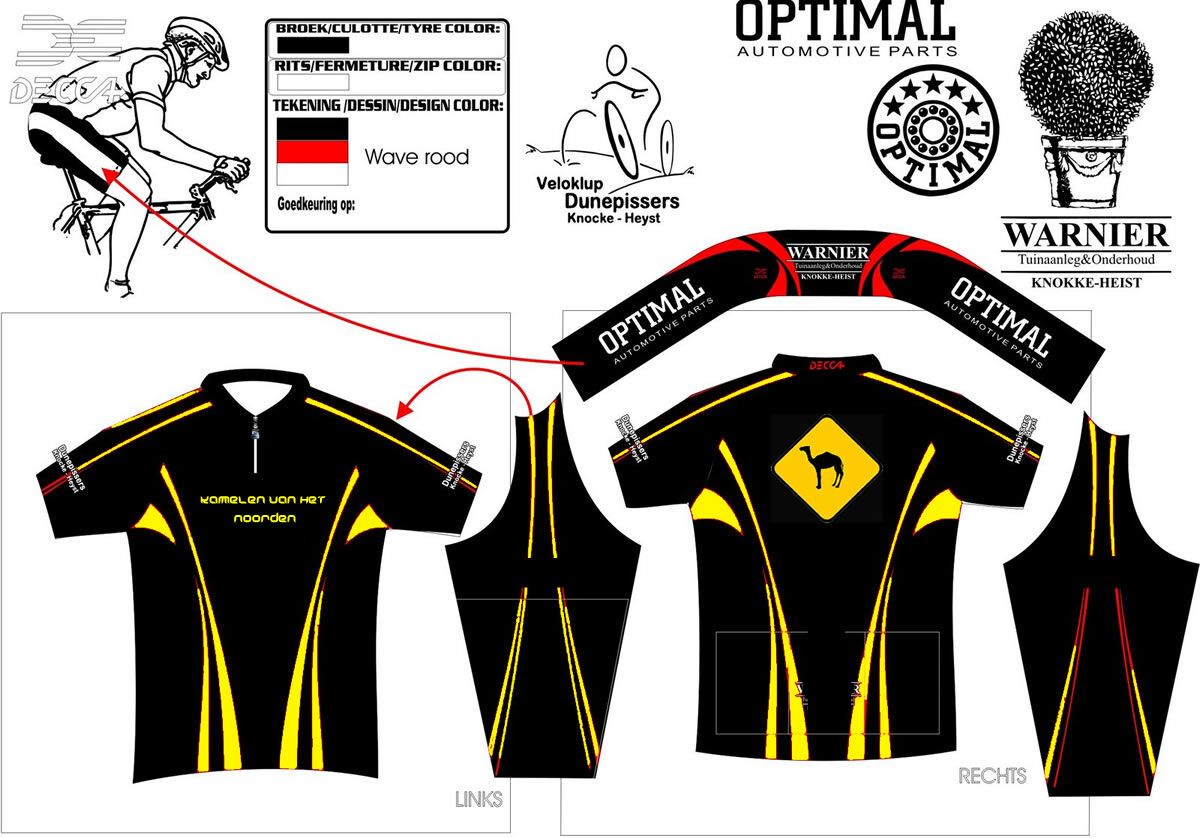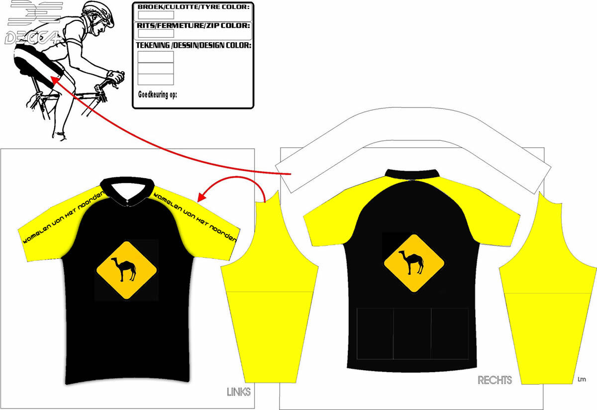 - Ik veronderstel dat het de bedoeling is in het uiteindelijk ontwerp 1 geel-tint te gebruiken. Persoonlijk vind ik het geel van het kamelenlogo mooier dan het geel op de mouwen (dus donkergeel ipv fluogeel).