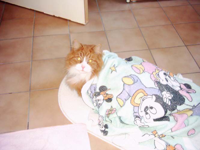 Op deze foto zit Charel in een handdoek gewikkeld. Meestal vindt hij het wel leuk maar soms vindt hij het niet leuk. En dan durft hij wel eens krabben.