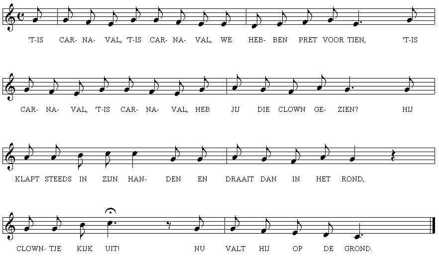 't Is carnaval, 't is carnaval we hebben pret voor 10 't Is carnaval, 't is carnaval heb jij die clown gezien? Hij klapt steeds in zijn handen en draait dan in het rond Clowntje kijk uit! Nu valt hij op de grond!