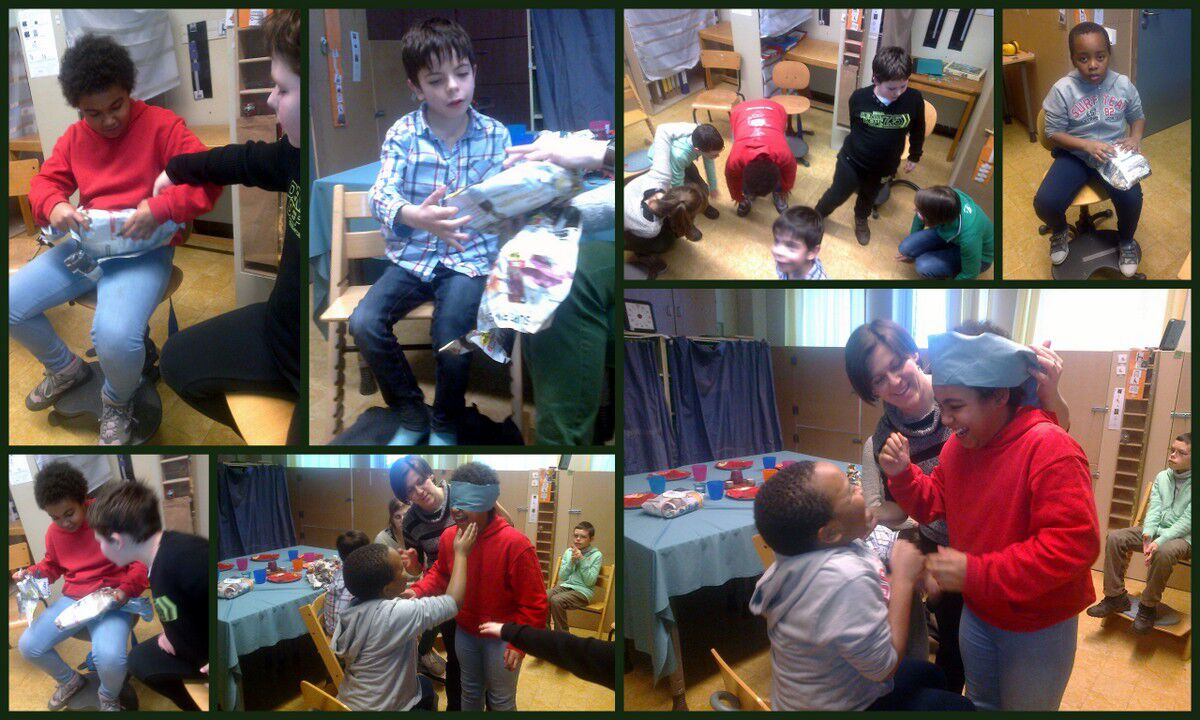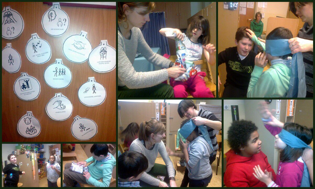 Eerst speelden we een muzikaalkerstpakket. We horen Kerstmuziek en geven ondertussen een cadeautje door, als de muziek stopt mag het kind die het pak vast heeft, de verpakking open maken. Dan zien we welke opdracht we mogen uitvoeren. Zo spelen we het spel verder tot als we bij het cadeautje komen; leuke bellenblazers!