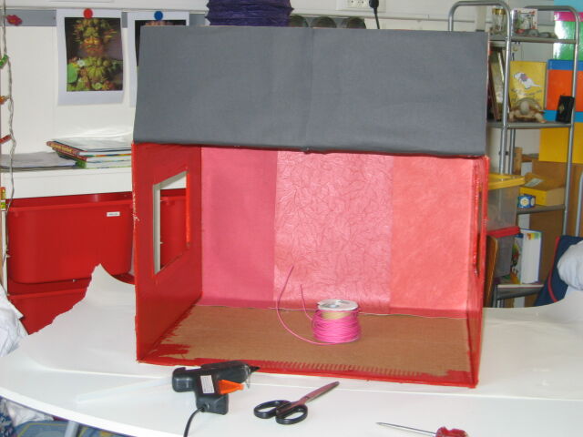 We maakten een EHBO-gebouwin de vorm van een kubus. Samen kwamen we tot de conclusie dat een kubus uit 6 vlakken bestond en dat elk vlak een vierkant was. Voor we onze vierkanten konden tekenen zijn we natuurlijk eerst op zoek moeten gaan naar hun eigenschappen. Nadien leerden we door gebruik van een lat en driehoek een perfect vierkant met 4 gelijke zijden en 4 rechte hoeken tekenen. Na het tekenen moesten we de kartonnen vlakken uitknippen. Omdat we ervaarden dat we het karton niet zo nauwkeurig konden uitknippen met een schaar hebben we met de nodige voorzichtigheid leren gebruik maken van een snijmes en een lat. Om devlakken aan elkaar te bevestigen opteerden we voor lijm. We gingen op zoek naar de meest geschikte lijmsoort en kozen zo voor het lijmpistool. We kenden het niet en vroegen ons af hoe zo een lijmpistool werkte. Er werd ons uitgelegd dat het lijmpistool verwarmd werd door de elektriciteit en dat daardoor de gestolde lijm kon smelten. Eens aangebracht, koelde het weer af, stolde het opnieuw en was het heel sterk. Voor andere toepassingen trachtten we steeds de gepaste lijm te gebruiken; knutsellijm, plakstift, sterke lijm en secondelijm. Eerst stond alles wat wankel maar samen zochten we hoe we dingen steviger konden maken. De kast in de EHBO-ruimte werd in één stuk gemaakt. We leerden dat een balk kan ontplooid worden en dan weer in een gestoken worden. We gingen samen op zoek naar de verschillende structuren bij het tegelleggen en ontwierpen zo een vloer. Na het maken van ons gebouw konden we door de verschillende ramen kijken en kwamen zo tot de vaststelling dat het zicht afhankelijk is van het standpunt.
