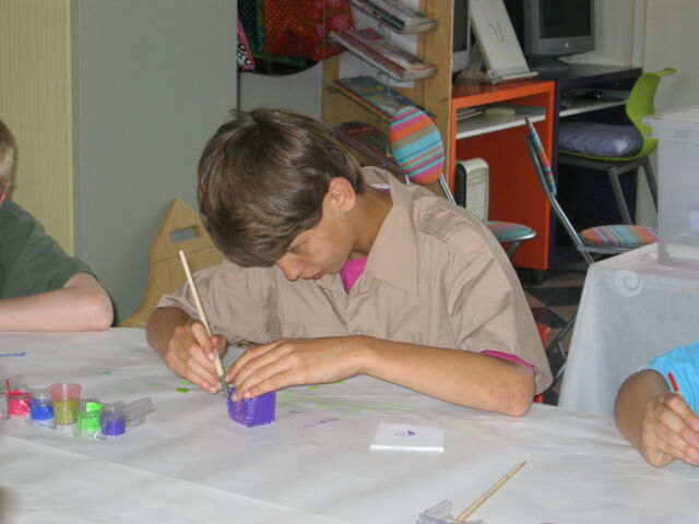 De ondergrond van de tuintjes was nu in orde. De tuintjes werden ook nog versierd met bloemetjes en boompjes. We maakten de stengeltjes van de bloemetjes met behulp van ijzerdraad. De juf gaf ons een stukje ijzerdraad en we draaide deze zorgvuldig rond een balpen. Op deze manier maakten we veertjes. Op ieder veertje werd een bloemetje geprikt en boven het bloemetje werd een pareltje bevestigd en vastgemaakt met behulp van een klein overschotje aan ijzerdraad. Het veertje werd door het karton geprikt en op de achterkant van het karton omgeplooid. De stam van de boom werd gemaakt door telkens twee kurken van wijnflessen bruin te schilderen en op elkaar te bevestigen met behulp van snelklevende lijm. Op de stam kwam een kruin door middel van groen kleurpapier samen te nieten.