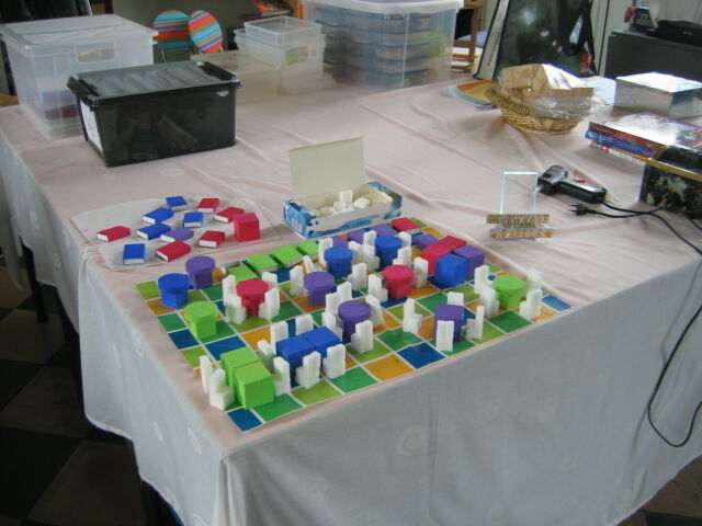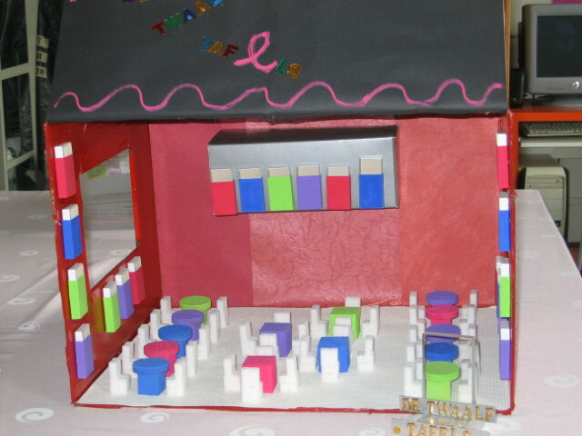 De tafels zijn geschilderde kurken. We zochten naar een alternatief voor lijm om ze op de plaat te bevestigen. Het lukte met tandenstokers.