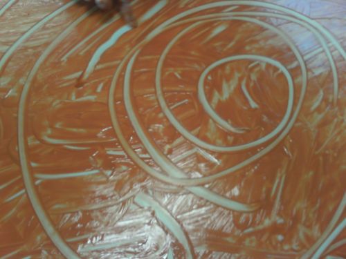 de werktafel schilderden we met onze vinger, schilderden we ook met rollen en
