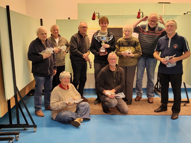 Schepen Vansina had ons toegezegd om te komen zien maar andere verplichtingen verhinderden dit. Schepen van Sport was wel aanwezig en nam de prijsuitreiking voor zijn rekening. Ook was hij zeer nieuwsgierig naar het verloop van de schieting en over de wapens, een nieuwe wereld ging voor de Schepen open.