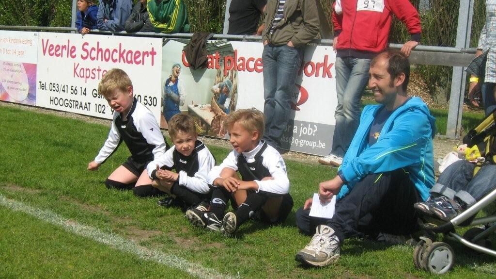 Afgelopen zondag mochten onze jonge zebra's aantreden voor hun 1e officiƫle tornooi in Lede. Op een heel mooi veldje mochten Joran, Kenzo, Maurits,Quinten, Lennard, Laurens, Warre, Lennard en onze nieuweling Nils hun kunnen tonen. Hun eerste wedstrijd tegen St-Denijs ging nipt verloren met 3-2. De wedstrijdjes duurden 15 minuten en kort nadien volgde een reuzematch tegen niemand minder dan KAA Gent. Zij hadden hun 1e wedstrijd overduidelijk gewonnen met 10-0 maar de zwart-witten konden de verliesscore beperken tot 7-1. Borsbeke was de enige ploeg die een doelpunt kon scoren tegen de buffalo's (zij werden dan ook eindwinnaar). Voor de laatste voorronde wedstrijd ging RC Wetteren voor de bijl met 2-0. Helaas, het doelpuntensaldo zat een beetje tegen en na nipte verliesbeurten tegen Schroevers Moorsel en Lebeke Aalst met tal van positiewissels tot gevolg konden onze duiveltjes fier hun tornooi afsluiten met een welverdiende trofee. Even meegeven dat onze -7 volgende zaterdagmorgen een tornooi spelen op Ksc Wilskracht Hofstade met wedstrijden om 10u,10u30,11u30 en 12 u.