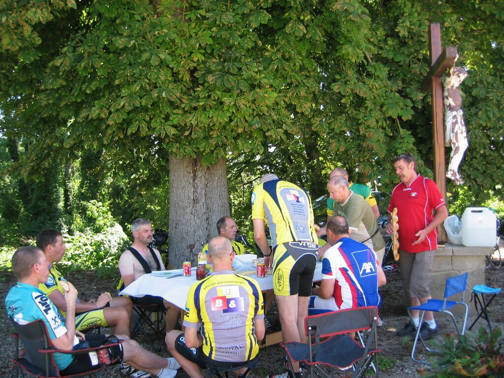 Na deze vrij lange verpozing rijden we terug verder door de regio van de Morvan (het groene hart van Bourgondië). De hellingen zijn misschien kort, maar blijven vrij steil, nijdig bij momenten. Dit maakt dat het zweet aardig naar beneden parelt. Twee uur na ons bezoek aan Vézelay wacht ons dan ook, niets te vroeg, een prachtig déjeuner sur lherbe. De Belgische vlag wijst ons op onze stopplaats, prachtig in een weiland, in de schaduw uitgekozen door onze begeleiders, Jan en Louis. Louis heeft extra zijn best gedaan. Hij is immers vandaag 30 jaar gehuwd en een prachtig, smaakvolle koude schotel werd ons deel. We bedankten Louis savonds er extra voor met een kleine verrassing. Louis (en Chris) nogmaals proficiat. En de kei-goede-foto is voor jullie allen, thuisblijvers