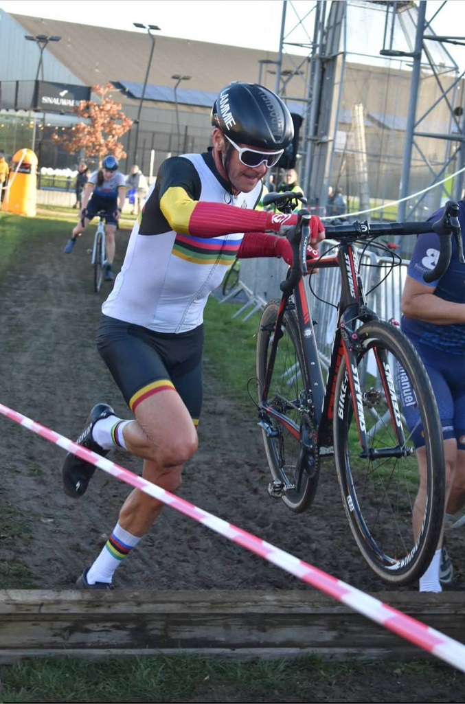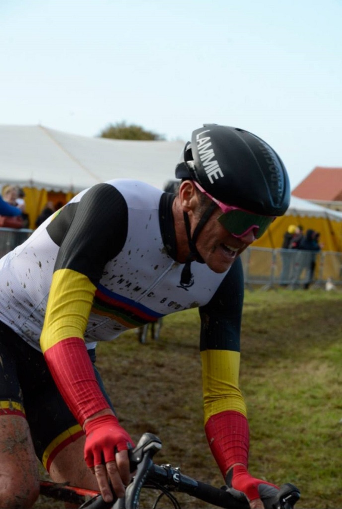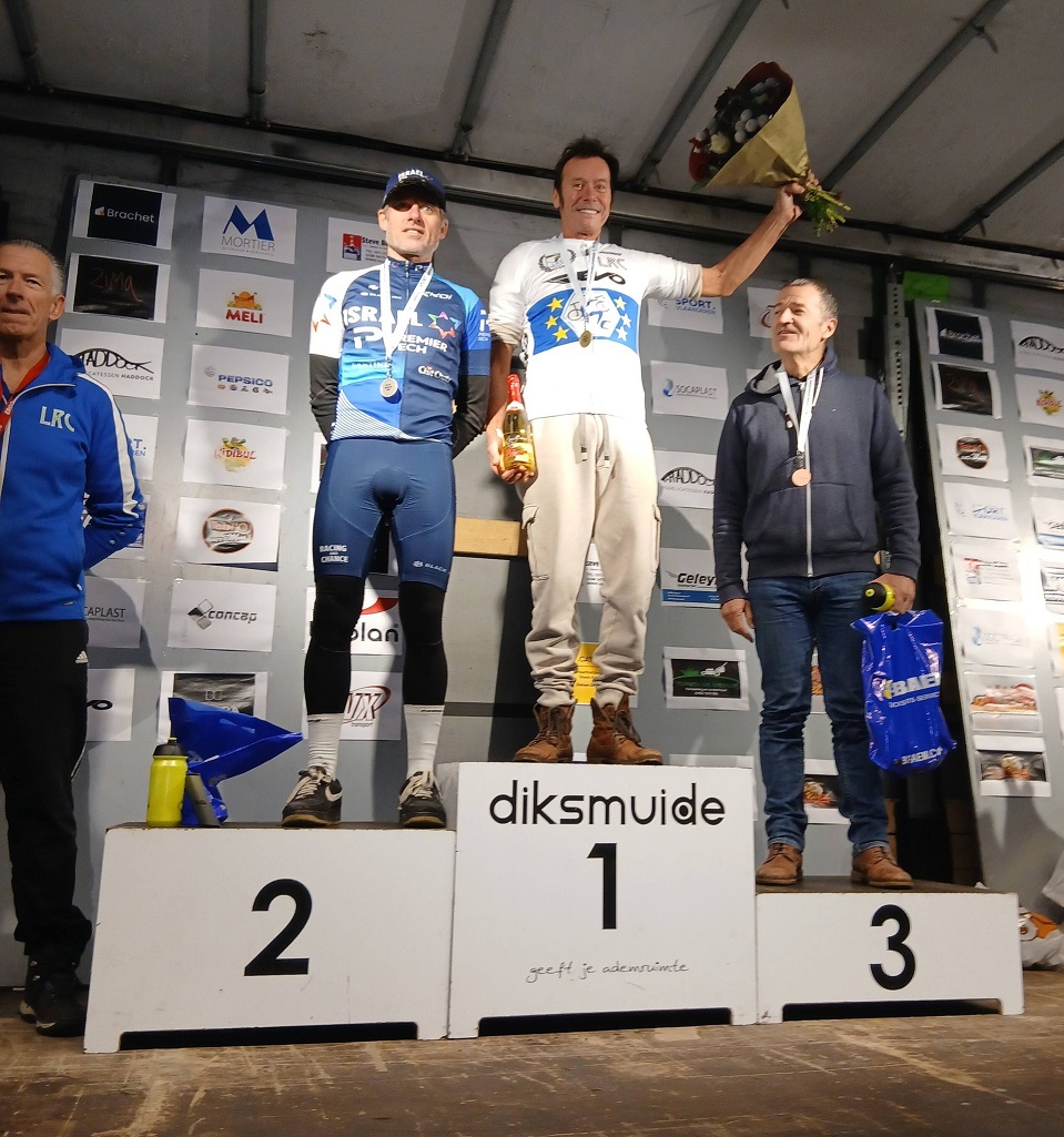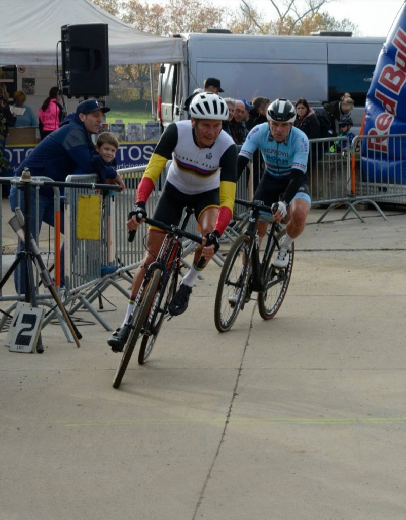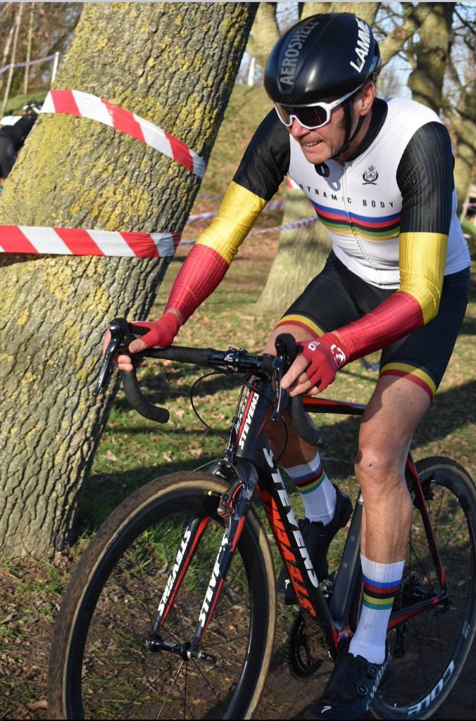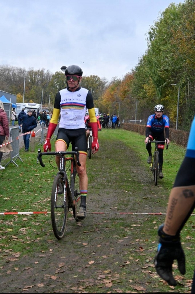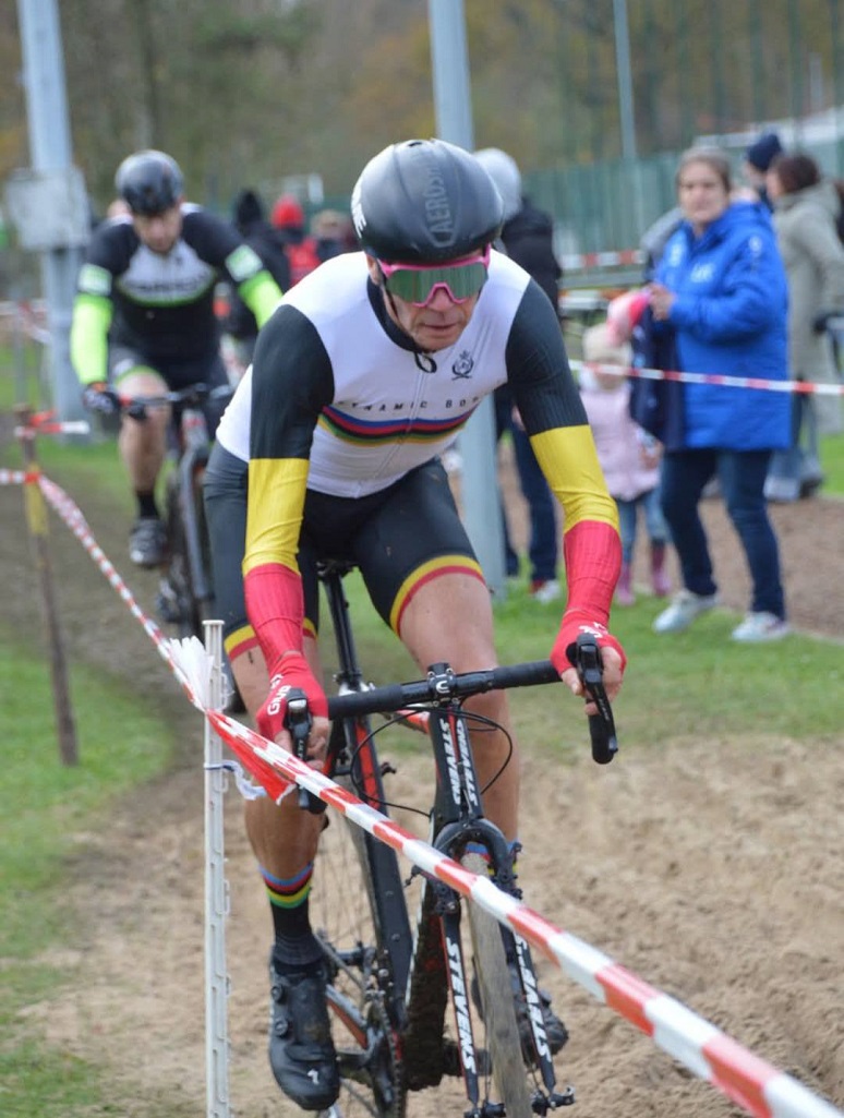 Sportpark ter pluimen is al meerdere jaren het episch centrum voor een lrc veldrit, vandaag was er zowaar zelfs een Europees kampioenschap georganiseerd. Een zeer mooie technishe omloop met alles erop en eraan. Doordat ik vandaag kinderoppas had op de wedstrijd ( mijn zoon Laudelino reed er ook) was het onmogelijk om me los te fietsen voor aanvang van mn wedstrijd. Dat laat zich altijd voelen maar gelukkig is mn niveau degelijk te noemen waardoor ik me wel kan veroorloven om een rondje in de luwte te fietsen. Christophe Logier, Fabien Hanssens, Peter Deruyter, Tonny Defeyter en Kristof Roelstraete waren me allen voor in de openingsfase. Omdat het meteen op single-track te doen was moest ik wel uit mn schulp kruipen. Als derde kon ik de eerste heuvels bedwingen. Eénmaal de heuvelpartijen achter de rug, halverwege de ronde, zat ik waar ik moest zitten in het zog van de beresterke Logier. In de tweede ronde kreeg Logier af te rekenen met een weersparrige ketting, hij kreeg het euvel niet meteen in orde en zodoende kreeg ik een kloof van 30" cadeau. Wachten was uiteraarde niet aan de orde want op zo'n omloop schuilt achter iedere hoek het gevaar. En ja.........iets over halfwedstrijd toen ik een voorsprong had van 45" had mn achterwielbody plots geen grip meer, ik kon niet verder. Mn reservefiets stond aan de andere kant van de omloop. Ik vroeg aan een drietal mensen die met een fiets stonden voor hun renner of ik hun fiets mocht gebruiken maar ik stuitte op een njet, wat uiteraarde wel te begrijpen is. Ik besloot om de wedstrijd te verlaten en stapte naar mn auto tot plots een welwillende dame een fiets aanbood van haar man Martin Gino, die dame Sabine Desmet mag ik dus heel erg dankbaar zijn want zonder haar had ik vandaag nooit gewonnen, laat staan die mooie Europese trui niet veroverd. Een woord van dank is hier dan ook méér dan op zijn plaats. Het was mn 10e Europese kampioenentrui !