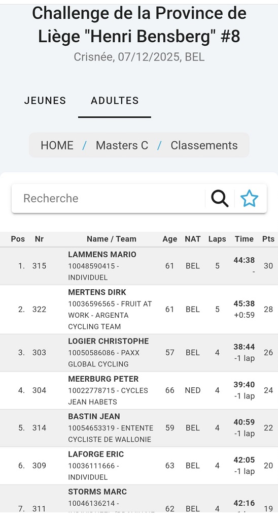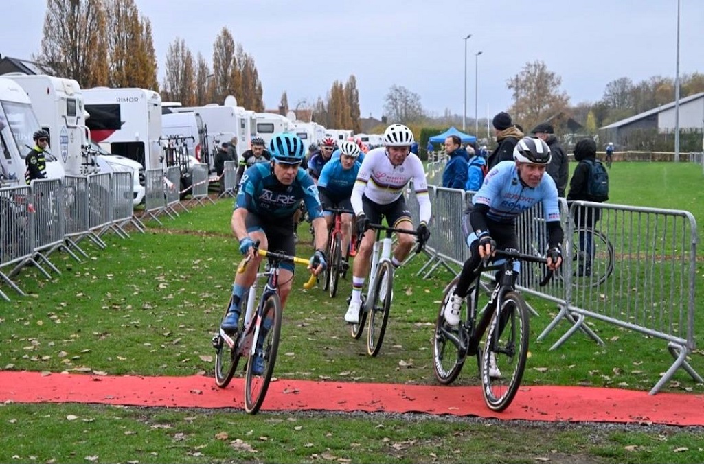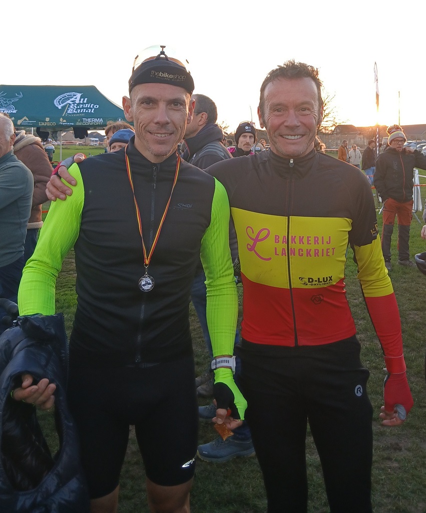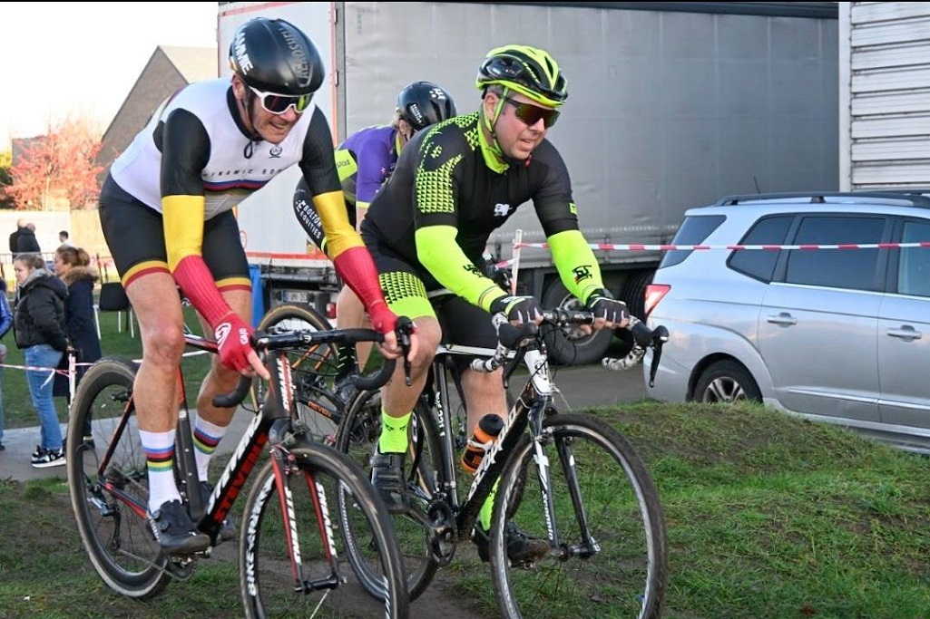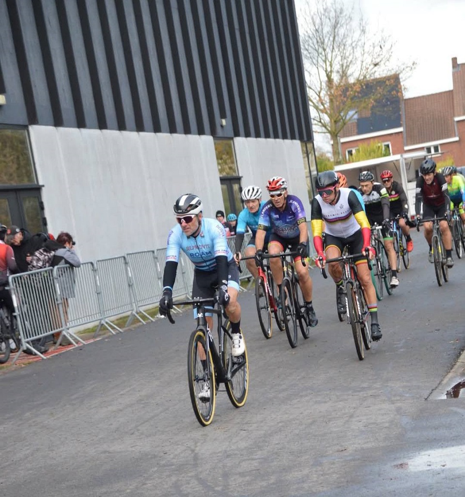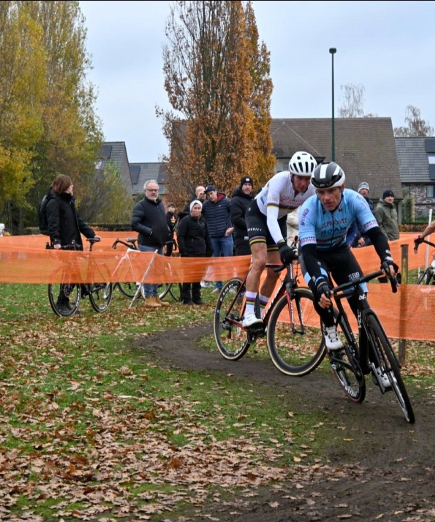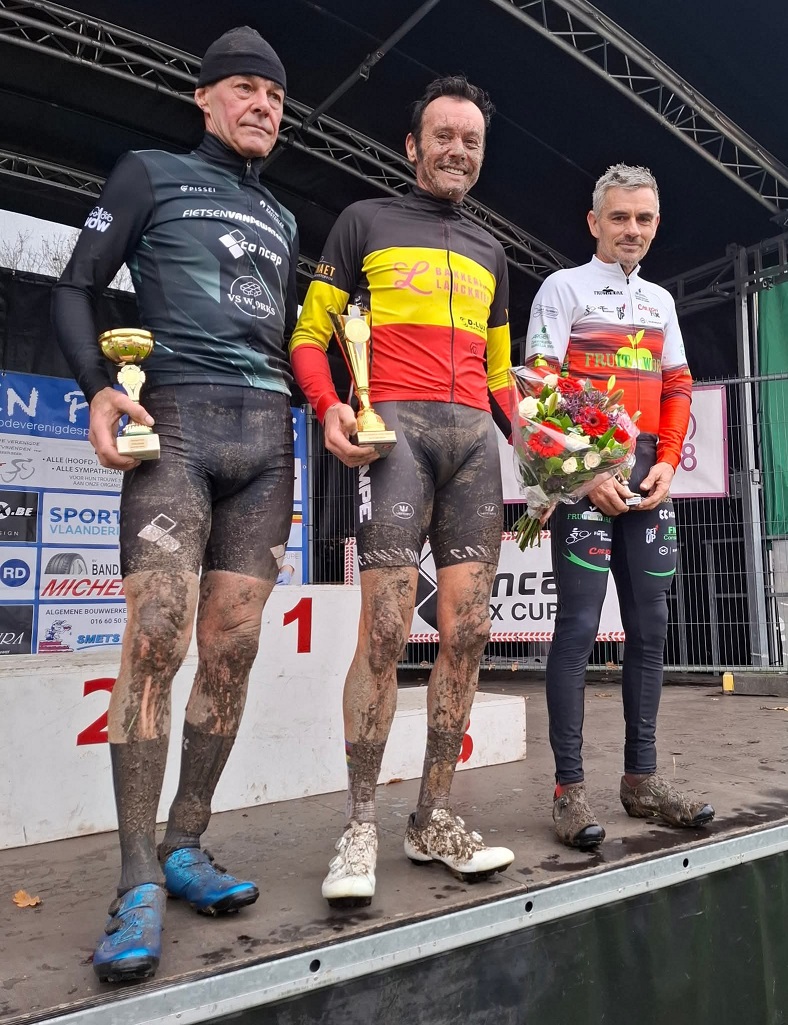 Vandaag net als vorige week een veldrit bij Belgian cycling, dit keer de Ravestein parkcross te Hever. Het was nog donker toen ik terplaatse kwam maar ik geniet daarvan. Auto uitladen, mn tentje opzetten en als één van de eersten de omloop minitueus verkennen, geen enkel detail mag me ontglippen, dan is Lammie op zn best. En dit was ook zo vandaag. Ik nam de kopstart maar Benny Vanstaeyen zag dit niet graag gebeuren en snelde me na enkele veldmeters voorbij. Ik nam zn wiel en na een halve ronde waren we al met ons twee afgezonderd en begonnen we de voor ons gestartte renners op te rollen. Dit is altijd een beetje een gevaarlijke situatie want sommigen doen de deur dicht nadat ze gepasseerd worden maar weten niet dat er nog een achtervolger kan aankomen. Symphatieke Benny liet hen dit telkens weten dat we met twee aan het inhalen waren, knap van hem. Half wedstrijd dezelfde situatie op de glibberige maar snelle bosomloop maar toen gebeurde een bepalend koersfeit. De waal Michel Bajorek die we eerder voorbij hadden gestoken remonteerde onsbeiden, ik haakte mn wagonnetje aan bij Michel zodat Vanstaeyen in derde positie kwam te zitten. Bajorek ging zo wild te keer dat Vanstaeyen een stuurfoutje maakte en plots op een kloofje zat van 5". Ik heb dit nooit opgemerkt omdat ik zo gefocuusd was om Michel ( van de voor ons gestartte reeks) te volgen. Toen ik even later op een keerpunt op de omloop kwam merkte ik op dat ik mijn concurrent voor de overwinning kwijt was. Het was een zalig gevoel om te weten dat ik naast een overwinning terug 60 startpunten ( het maximum) zou behalen. Dirk Mertens beloonde zijn regelmaat met een derde plaats op 1'04", Vanstaeyen was uiteindelijk tweede op 31" van de man die hier wekelijks voor jullie een wedstrijdverslagje neerpent.
