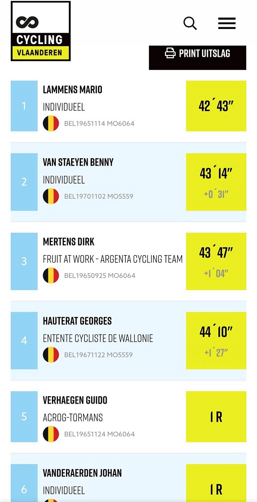 Opladen voor de wedstrijd was dus niet moeilijk, ook ik kon mn steentje bijdragen door een topprestatie neer te zetten. En of ik goeie benen had. Eén week na het allesbepalende Belgische kampioenschap in Maldegem was er van een dipje geen sprake. Net voor de eerste zandstrook nam ik de leiding over van Christophe Logier en ik was weg voor een solotochtje van 40'. Halverwege had ik een voorsprong van iets méér dan 1' en kon ik al met de handrem op rijden. Mijn seizoen duurt tot 21 februari dus onnodig om met het krachtenarsenaal te woekeren. De 36é overwinning was een feit en dit is het enige wat in de analen van mijn erelijst overblijft. Logier was knap tweede Roelstraete Kristof vervolledigde het podium die er nooit komt voor mij want dit wordt pas uren na de wedstrijd afgeroepen, dan ben ik al vollop bezig met andere huishoudelijke taken