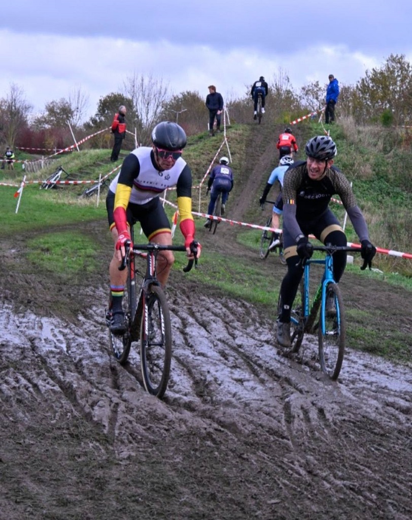 Vandaag deed ik het in het Luikse achterland, meerbepaald in Crisneé. De Waalse afdeling van Belgian Cycling dus mocht ik ook mn tricolore trui omgorden. Een omloop op een flank met op het hoogste punt een watertoren. Tijdens de verkenning merkte ik al op dat het een dagje draaien en keren zou worden gekruid met enkele pittige hellingen en heel veel modderbrei waardoor techniek zeer belangrijk zou worden. Beide fietsen moest ik alsnog ombouwen naar rhino's want ik had me op zo'n scenario niet voorbereid. In de gietende regen en striemende wind stonden we vertrekkensklaar. Doordat de tuben niet voorzien waren van veel druk was het opletten geblazen tijdens de start. Wonderwel nam ik de kopstart en in de lange afdaling daaropvolgend kwam er niemand langszij dus kon ik aan mijn ding beginnen. Reeds in de eerste meters cross moest ik al renners voorbij steken die in de reeksen voor mij gestart waren. Dit moest ik een volledige wedstrijd doen want er bleven maar 3 renners voor mij van het volledige pak jongeren en dat waren er toch een vijftigtal. Limburgs kampioen Dirk Mertens kwam echter nooit in het stuk voor en moest uiteindelijk een kleine minuut toegeven, Logier, mijn oostvlaamse vriend, moest de wedstrijd zelfs één rondje vroeger staken omdat hij gedubbeld was van de allerbeste elite 3 van Belgie Thomas Granier. Het podium vond plaats 20' na onze aankomst, verkleumd maar blij namen we daar aan deel.