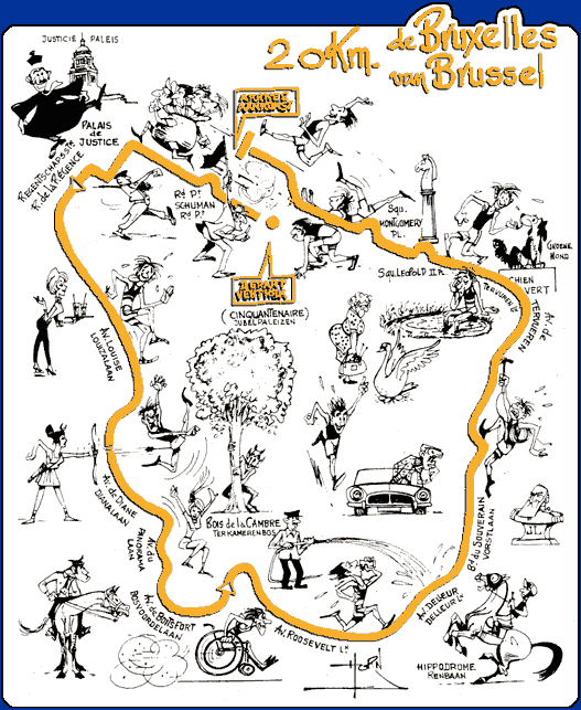 Eindelijk was het zover, de 20 km van brussel. Voor de eerste keer deed ik er aan mee. Om 11.30 vertrokken we naar de hoofdstad. Er waren niet minder dan 39 olifantjes die meeliepen!! Mijn achillespees bleek genezen, alleen wat last van buikpijn door de stress??. Reeds 50 minuten voor de start stond ik al in de box. Ik had me ingeschreven om mee telopen met hazen voor een tijd van 1u30 Zo stond ik nog redelijk goed. Dan eindelijk de start... Ik stond zelf bij de rode ballonen van 1u20 en begon die te volgen. Na enkele km liet ik ze echter lopen. Ik dacht, zolang de blauwe ballons me niet inhalen zit ik goed; Na ongeveer 10 km (het was wel warm, de zon kwam erdoor, geen regen!!!) haalde ik Ronny in van de olifant. Het ging nog altijd goed. Ook de drankbevoorading wat goed. Rond km 15 à 17 echter begon ik lichtjes pijn te krijgen schuin onder mijn re knie. Ik had vorig jaar ook gehad in de halve marathon in ploegsteert. Doch het ging nu toch wel beter en plots kwam Francis Coucke bij me lopen. Zo'n goeie loper, dus ik was wel goed bezig. Ik probeerde hem enige tijd te volgen maar het ging toch iets te snel en liet hem maar lopen. Nu begon het zwaartste....Ik wist niet precies hoever het nog was, zag dan plots de drie bogen van de aankomst maar dat was toch nog een eindje hoor en vals plat naar boven zo een 3 km. Ik probeerde nog alles te geven wat ik kon en eindige uiteindelijk in een tijd van 1:26:34 Hiermee bereikte ik de 1417 e plaats op 28 000 lopers. Na de wedstrijd nog enkele bekenden gezien waaronder Christ Viaene (1u24.28): schitterend zeg!!. Ook mijn baas Dr. G. Van Parys gezien. Ook sterk gelopen in 1u27.17. Ik had geluk dat ik nog voor hem was!! Als bekende voor de start Jan Leyers van Soulsister gezien. Zijn tijd: 1:41:20 Toen we rond kwart voor 6 vertrokken kwamen er nog altijd lopers binnen......man man man... Na de douches in Wabo en een Duvel vertrokken we naar een grieks restaurant'LE PARTHENON' (www.leparthenon.com). Daar werd ons een apertief, voorgerecht hoofdschotel koffie en dessert voorgeschoteld. Daarna werd er nog flink gedanst en leffes gedronken door de olifantjes. Blijkbaar hebben ze, tijdens de wedstrijd, nog wat ingehouden.... Vermoeid (ik weer lichtjes spakkend) kwamen we rond 2 uur toe in oostende.. Het was een mooie dag en wedstrijd, vind ik, die zeker de moeite is. Volgend jaar sta ik er weer... Nu weer wat rust, hopelijk valt mijn pijn aan mijn re achillespees mee om volgende zondag weer paraat te zijn in de mc bride run van ieper naar poperinge. Dirk alias lazyhorse