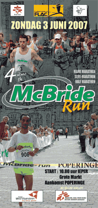 Na de 20 km van brussel zondag ll, nu de mc bride run: een halve marathon. Deze week maar 1x gelopen wegens pijn re achilles + vermoeidheid brussel. Het was vandaag zeer vroeg opstaan, rond 6 u15 om om 7 uur 05 te vertrekken aan clint zijn deur tesamen met koen en johan die we oppikten in gistel. Nogmaals dank voor het vervoer CLINT. We reden naar poperinge (om de auto te zetten) en keerden met de trein terug naar ieper (start). De zon scheen en het was tamelijk warm. De eerste 5 km verliepen goed, toen kwam clint me al inhalen. Na enkele km verder kwam ook koen bij me lopen. Ondertussen waren christ en johan al in een sneller tempo voor me. Aan km 10 wist ik al dat ik de beoogde 1u25 niet zou halen. Het was afzien verder..Koen liep zo een 30 sec voor me maar hoe verder we naderenden hoe verder hij uit het zicht verdween... De laatste kilometers bleven duren. Uiteindelijk eindigde ik in een tijd van 1u34'05". 2 halve marathons in bijna 1 week waren voor mij toch iets te veel van het goede. Weer pijn in re achilles, wel geen pijn meer gevoeld onder de knie..! Daarna nog lekker gegeten aan het koud buffet voor maar 4 Nu 2 weken geen wedstrijden meer... Tijd om wat te herstellen om dan geleidelijk weer wat meer te trainen op klaar te staan voor het drieluik in juni: jean-bart, nieuwe stad en conterdam. proficiat aan Christ Viaene (1 28 17) en johan wathy (1 29 06) en koen ( 1 31 45) en vooral clint met zijn mooie 76ste plaats in een tijd van 1:27:10 Bij Francis liep het ook wat minder vandaag (1 32 13)... Misschien zat brussel er toch voor iets tussen vandaag voor ons beiden? Tot later