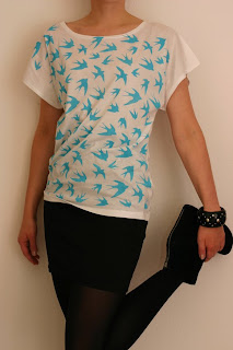 Met deze vogeltjes : kan je heel wat mee pimpen! Schoenen,rokjes,kleedjes, panty, t-shirt enz.. DIY: vogeltjes op een t-shirt: Bendoigdheden: - schaar - textielstift - potlood - foto's van miu miu vogeltjes afgeprint op dik papier - wit t-shirt