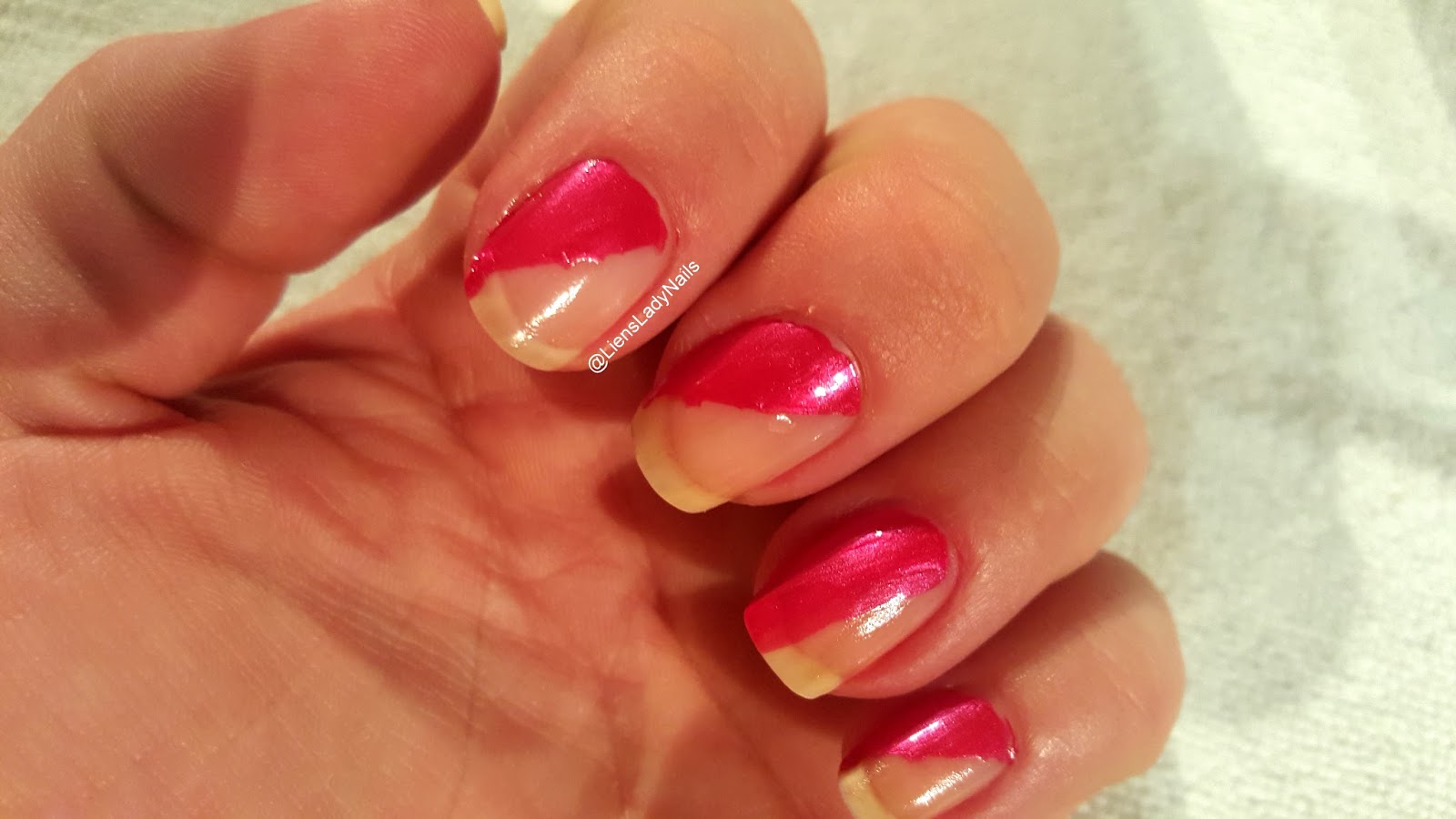 verschillende breedtes striping tape diagonaal op mijn nagels gekleefd.