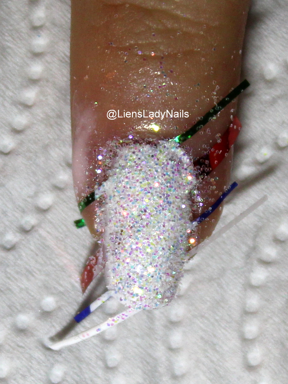 vinger even om zodat je het te veel aan glitter van je nagel laat