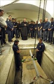 Hierboven de ontgraving van de kist in de crypte onder de basiliek.