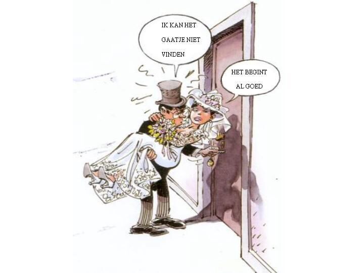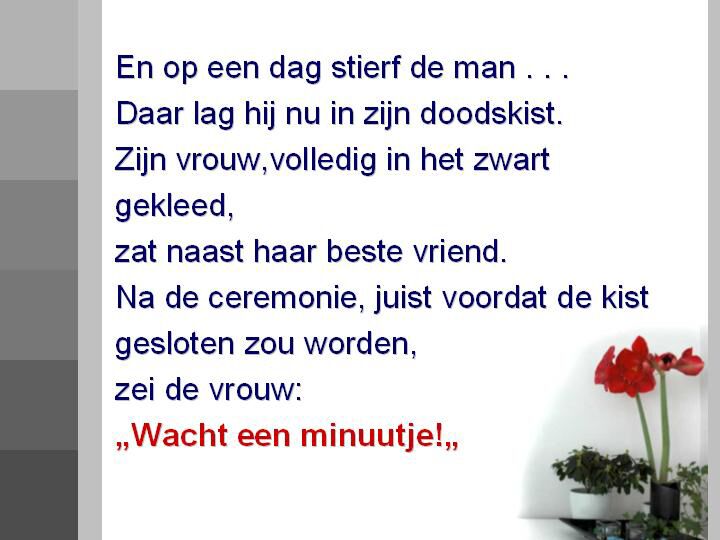 Na bijna een halve eeuw getrouwd te zijn, sterft de man, niet lang daarna komt ook zijn vrouw in de hemel. Zij ziet haar man, vliegt hem in de armen en roept: 'Liefste, wat een geluk hier jou te vinden ! De man kijkt verbijsterd op en zegt: 'Miljaarde! Nu niet beginnen zeveren hé! De afspraak was: Tot de dood ons scheidt!!!