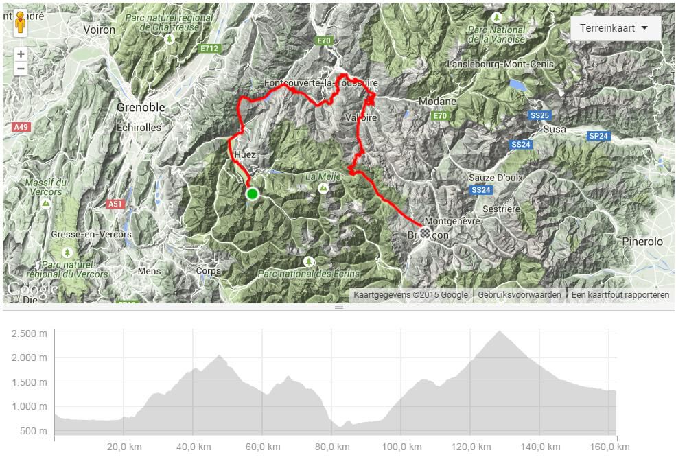 Vandaar de wijziging van het parcours. En omdat de wegen er in die regio niet voor te kiezen liggen zijn we genoodzaakt om ondertsaande route te nemen. De nieuwe route zal dus via de Glandon naar de Croix-de- fer gaan. vervolgens krijgen we de Mollard en de  Telegraphe nog voorgeschoteld om dan via de Galibier richting Briançon te rijden. En dit op het einde van onze tocht wanneer de renners er al meer dan 1000 KM op zitten hebben. Dat beloofd. de nieuwe route is 162 en een halve kilometer lang (dus een kleine 50 KM meer dan oorspronkelijk voorzien) en met 4914 hoogtemeters.