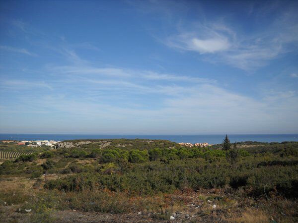 Foto 5: Narbonne-plage gezien vanuit 'le Massif de La Clape". Maison Matisse ligt op een kleine 30 minuten van verschillende badsteden. deze foto is genomen op weg naar Narbonne-plage. Indien je kiest om naar Narbonne-plage te gaan moet je door het "Massif de La Clape". Een krijtrotsgebergte met een onberispte natuur. Terwijl je door La Clape rijdt zie je de zee telkens aan je zijkant, dichter en dichter naderen, tot je beneden bent. Voor wie eens de zonsondergang wil zien is La Clape een uitgelezen locatie om de zon in de zee "te zien zakken".