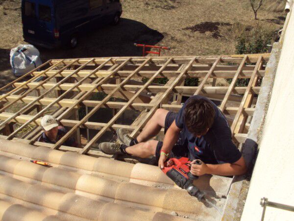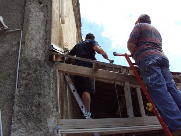 Nadien konden we pas aan het echte werk beginnen. Omdat begin augustus de dakwerker komt om het dak van het huis te vervangen is het nodig dat hij aan de 4 zijden van het huis stellingen kan plaatsen. Daarom moeten de pannen van het dak van de veranda er ook af. Nu op zich was dit een werk dat sowieso moest gedaan worden om dat de veranda op zen "Frans" gezet is... rot hout en goed hout door elkaar, isolatie die op niets trekt enz...