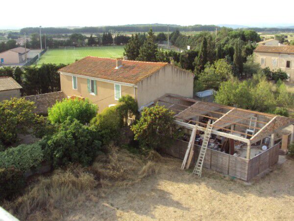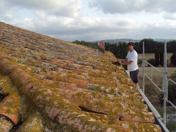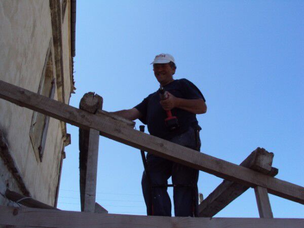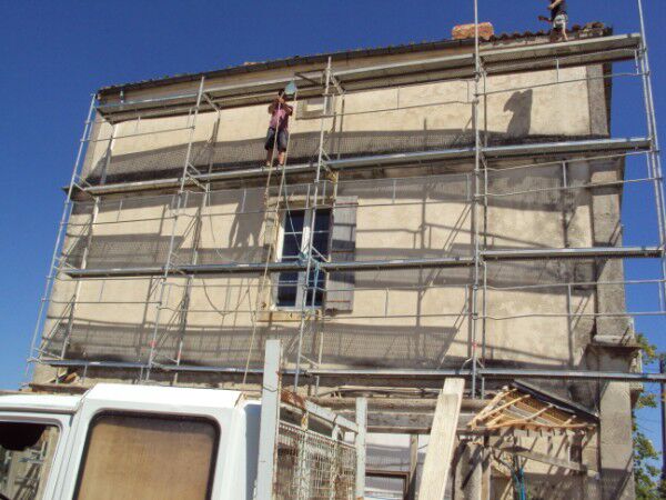 Samen met onze dakwerker hebben we dan de stellingen kunnen zetten aan 2 zijden van het huis. Morgen zullen we de rest van de stellingen verder plaatsen en gaan we ook bekijken hoe we de stellingen aan de 2 andere zijden gaan zetten want daar zijn een paar obstakels. Als er mensen zijn die zeggen dat de Franse stielmannen niet snel werken... dan nodig ik hen echt eens uit om naar hier te komen want Mr Belotti is een echt machien :).