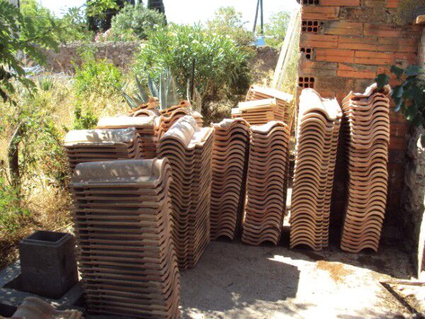 Vandaag hadden we onze afspraak met de dakwerker en hebben we ervoor gezorgd dat onze veranda helemaal "ontmanteld" is; maw alle dakpannen eraf, alle daklatten en kleine tussen latten en als laatste het merendeel van de grote balken. We hebben alle dakpannen samengelegd om ze later te kunnen hergebruiken.