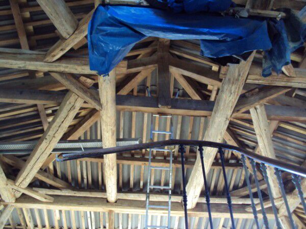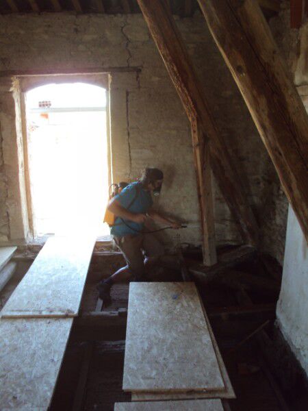 Na het ontstoffen van het dakgebinte konden we eindelijk beginnen aan het behandelen van de balken. We hebben nu de eerste laag kunnen geven. Gewapend met mondmaskers en veiligheidsbrillen waren we er helemaal klaar voor. Net zoals het ontstoffen ging dit ook niet echt makkelijk. Plaatsjes die zeer moeilijk bereikbaar waren, verstuivers die het niet langer dan 3 minuten volhielden, enfin we hebben moeten roeien met de riemen die we hadden.