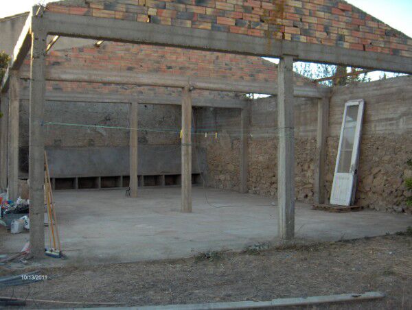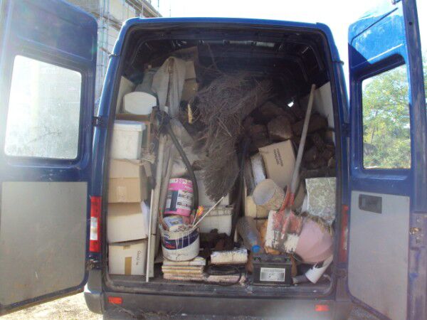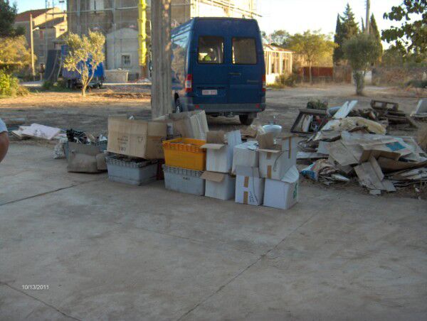 Omdat het product in de balken nog wat moet drogen konden we vandaag onze 2de laag nog niet geven. Daarom hebben we vandaag al het vuil dat toch al enkele dagen hier buiten lag naar het containerpark gedragen. Het waren 2 volle camionetten... . Uiteraard was het merendeel van het vuil afkomstig uit de hangar achteraan die nu mooi opgekuist is.
