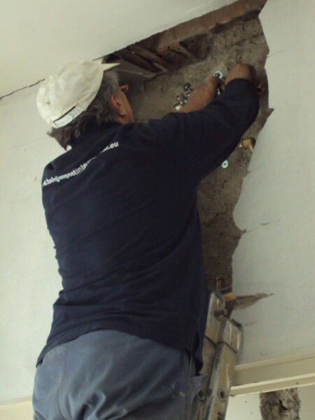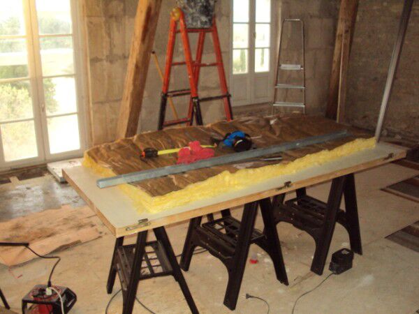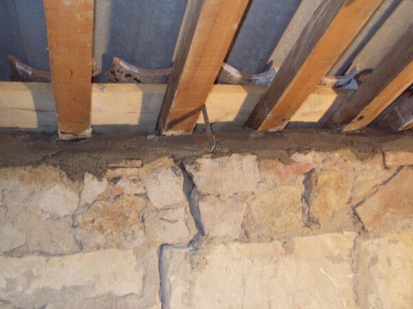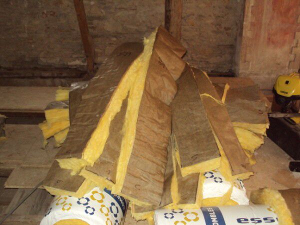 Vandaag hebben we al een stukje van de isolatie gesneden. Vandaag hebben we ze nog niet kunnen plaatsen tussen de balken omdat de muur nog moest worden bijgewerkt met mortel (zie foto). Er waren soms grote holtes tussen de balken en de muur en dat was vrij gevaarlijk omdat de balken dan geen steun hebben. Als de mortel morgen droog is kunnen we de isolatie plaatsen tussen de balken.