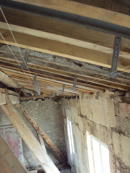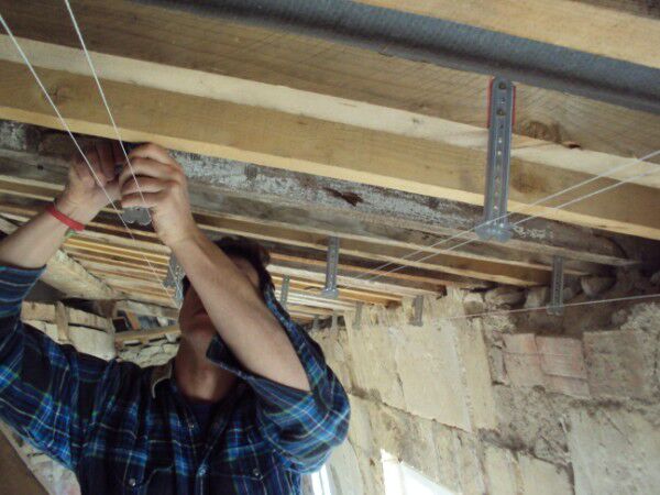 Normaal gingen we vandaag onze isolatie leggen tussen de balken maar blijkbaar moet je eerst alle hechtingen zetten om je vals plafond aan te bevestigen (als de isolatie er al ligt dan kan je die hechtingen niet meer vastschroeven in de balken). We hadden al wel eens een vals plafond gelegd thuis maar dat was een plat vals plafond... nu is het een schuin. We moesten een constructie maken met koorden om er zeker van te zijn dat het allemaal recht is en dat de helling correct is. Dit laatste was nu net het probleem... al onze kleine balkjes zijn niet bevestigd op de zelfde hoogte. Enfin het is een beetje moeilijk om het allemaal uit te leggen maar we hebben uiteindelijk de manier gevonden om zowel de lengte als de hellingsgraad op elkaar af te stemmen en dit voor de 4 rijen.